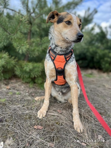 Dość ładnie chodzi na smyczy. Jest dużym psem o szczupłej budowie.